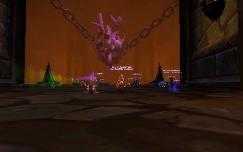 After getting through the first bit and avoiding being killed by the Iron Star, we went into the next dream-like phase. We asked who goes down what side. ‘Split evenly’ was the decission. when we did split, as I was the last to load I saw that everyone had dissapeared off to the left, so I went right just as Alryisa asked ‘Why is it just me and Roskva killing this add?’ I joined in the fight and we were soon a Hunter trio taking it down. I dont know if I was imagining it but it looked like we were in the Temple of the Red Crane with Garrosh in the middle making lots of purple shit on the floor. We were soon dropped back into the action and killing mobs and weapons. Im pretty sure I died at this point and then got ressed (lolz). The interesting part was when lots of blobbs started coming out. They were everywhere… We were told to ignore them and not to kill them or they will empower, through the haze of purple swirling shit and the blobs the only think I could really focus on was Garrosh. We wiped. Oh my days, we were so close yet just didnt manage to get over the last hurdle. I could smell the achievment and wanted it so bad there was no way I was giving up, no matter how shabby my dps was (I feel at this part I was being boosted through, I was the worst geared player there by a long shot but it was great experience, even if I was completely shit). Alryisa was picking up on the hunters not missdirecting enough (there were five of us after all) and we dusted ourselves off and started again. We got through, all the way to the blobs and even with some of them becoming empowered, towering beasts we gave it everything. Zillions of hunter pets stormed into the fray. Crows were everywhere, Garrosh was still hammering Alryisa and then suddenly… Cust scene…