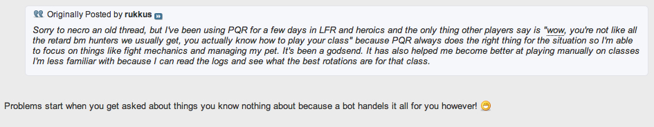 They don’t know how to play their class as they can’t do it for themselves. They need it to be able to focus on boss mechanics??? So without this they wouldn’t know Garroshs elbow from his arsehole? Or to them is the only part of boss mechanics is where to stand? This may just be me, but surely this would never work properly? The amount of times I’ve been in a raid group and we have had to switch around who does what and when, to make sure that everything is as mess free as it can be. If you’re firing off spells willy-nilly that the bot thinks is best but isn’t what the RL is asking for surely must be a recipe for disaster and an eventual raid kick, which means… you actually suck at playing… (possibly why you used a bot in the first place!)