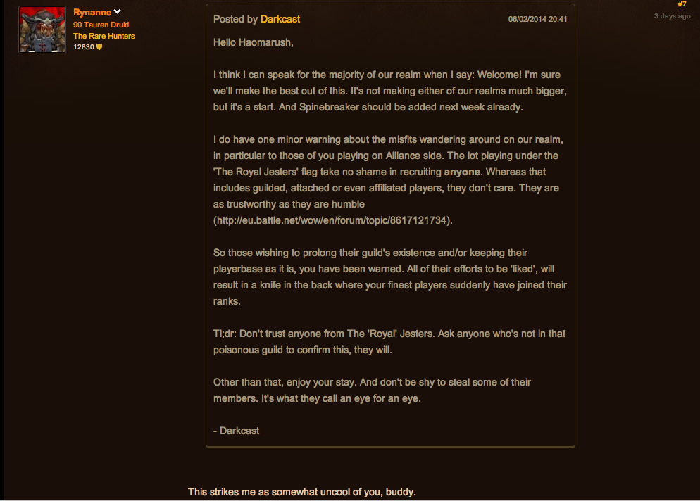 Not only was this person not even posting in our own realm forum, they clearly thought that everyone else needed to be warned about ‘our untrustworthy behaviour’ but they were not confident enough about their own convictions to post while logged in on a main.