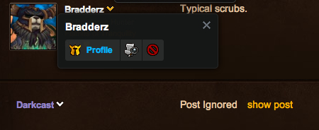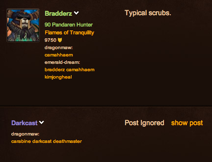 This is ok if you don’t mind looking through other forums to try and find other hidden posts. This is because the account the person was posting on is hidden, not just the char. I tried finding other posts in the Dragonmaw forums but there were a lot of posts to look through, so I got an extension for Chrome. It shows you the names of other people the account holder has used to post things. I was hoping that they had used their main at some point, I was not disappointed…