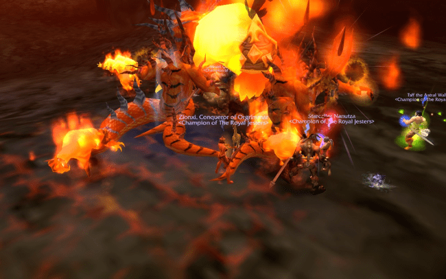 Antdruid and I had found some snake thing (I forget the name) and had poked with a sword/bitten it down to half health when we realised that half of us were with this boss and the other half were with Garr. We raced off to the others, the snake in tow. We arrived just to see them die. Antdruid then got punched in the muzzle and died. Oh my days, I was on my own. I had my pet, put his growl on and activated the crows when I heard over TS “it’s a wipe!” “oh my god, if we actually wipe in Molten Core…” funny as it was, I was on two-thirds health, my pet was not doing well despite my best efforts of spamming Mend Pet. I was doing so much of that, I wasn’t able to make time to poke the boss with my amazing sword. My pet died. Fuck.
