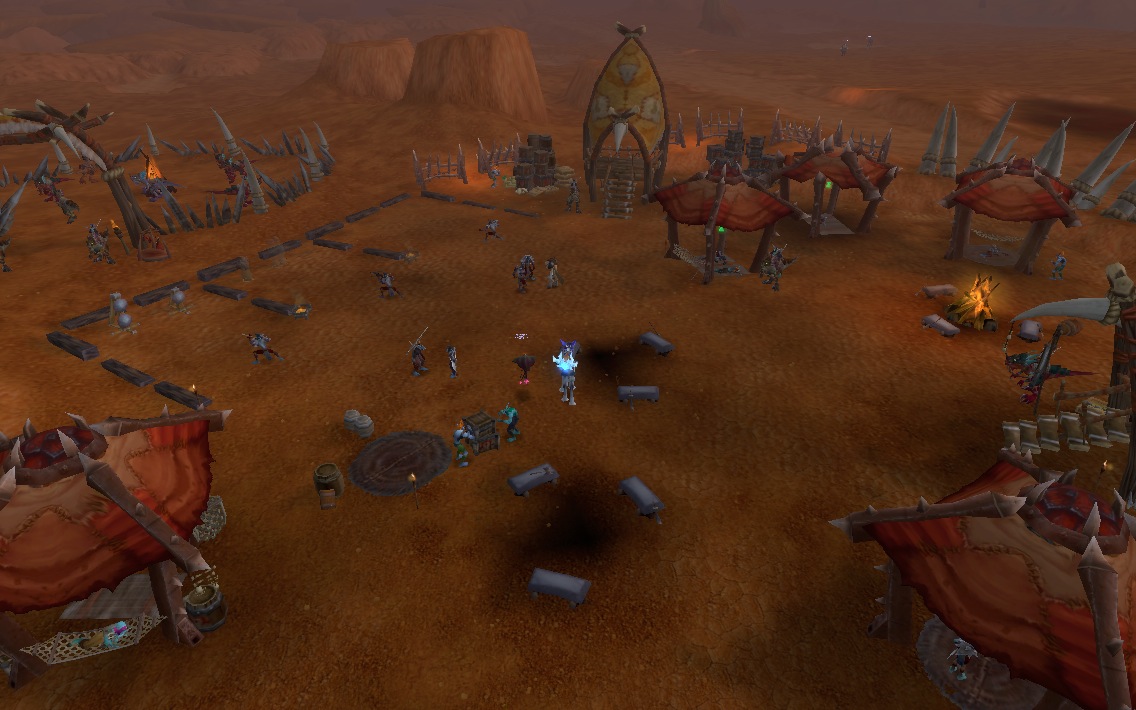 Anyway. (See! So easily distracted!) Being right outside Ogrimmar, we got distracted by the ‘village’ outside and went off to explore it while a few people were afk. There’s not an awful lot to see there. Some trolls, some more trolls, a troll by a tent… Then we caught sight of the horizon. There was only one thing to do, run through the Barrens!
