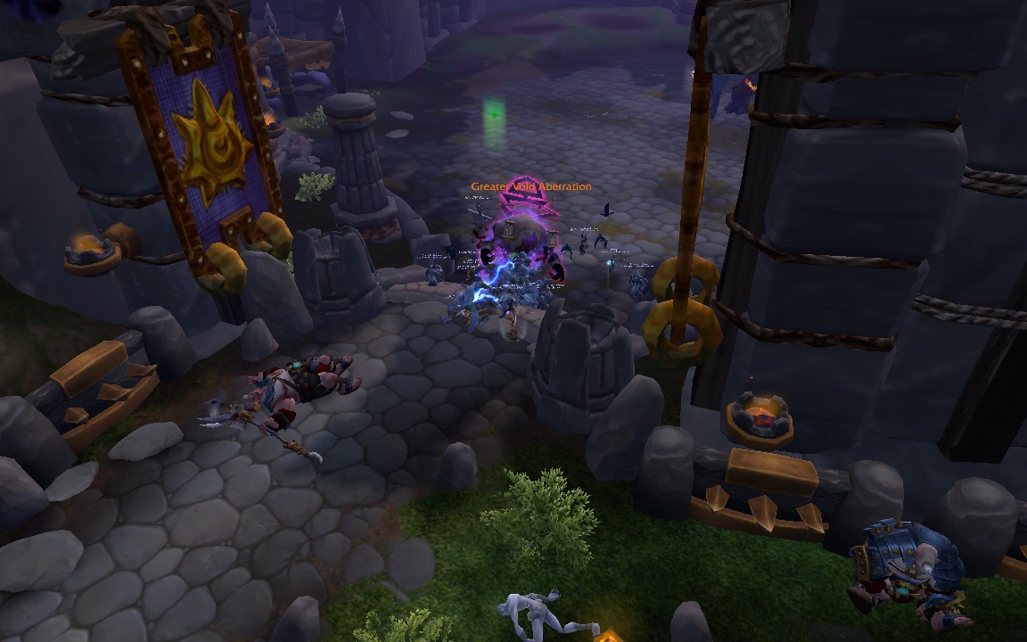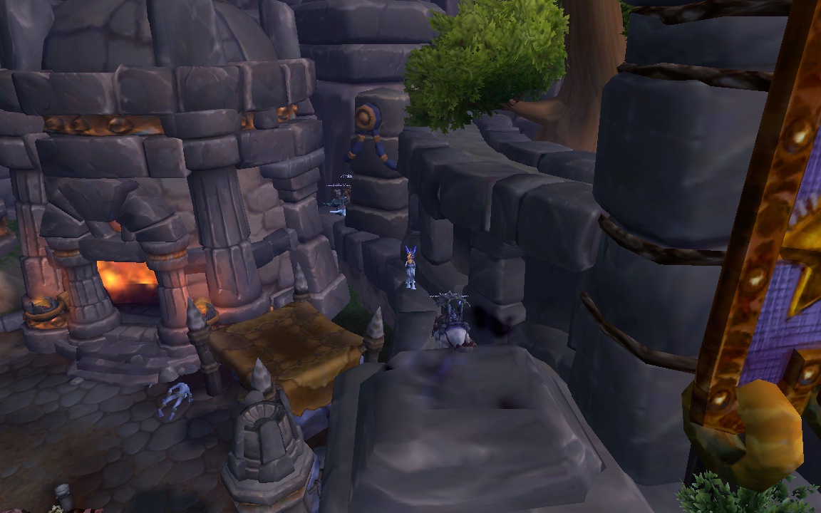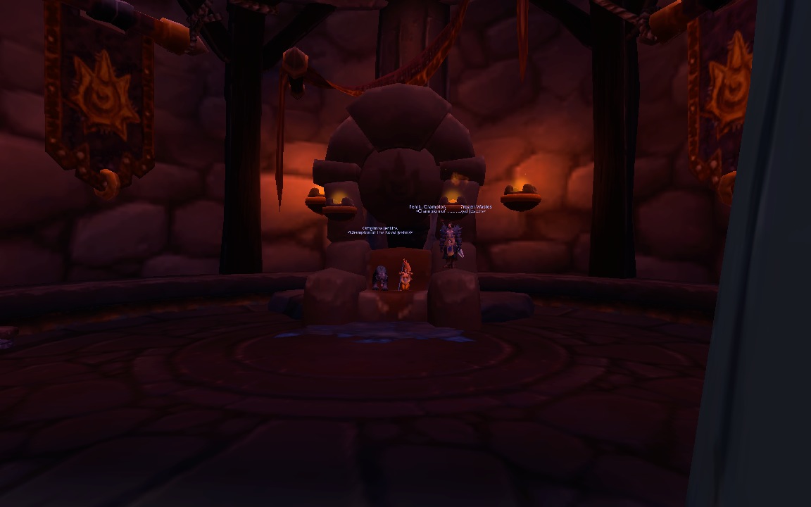 The run in was eventful, there was a whole army of Horde waiting outside the entrance to bludgeon any poor Alliance trying to get in. I was hit on the first set of steps going up and went to find my corpse. Running back I found it with two Hordies stood around it, waiting for me. I wandered up the second set of stairs closer to the entrance waiting for the ‘resurrect now?’ button to disappear, signalling I had gone too far away. I slunk up through the Horde, the button still there, was I going to be this lucky? I was up at the entrance, the button still in the middle of my screen. I clicked it, looking forward to just taking one step and being out of their way. “You are too far away” what? the button is still there! I backed up slowly and kept spam clicking it. My character announcing to me everytime that I was not in range… My last click ressed me right in front of a Hordie who was looking down the stairs. Mounting up and bolting for it I got in with only a scrape.
