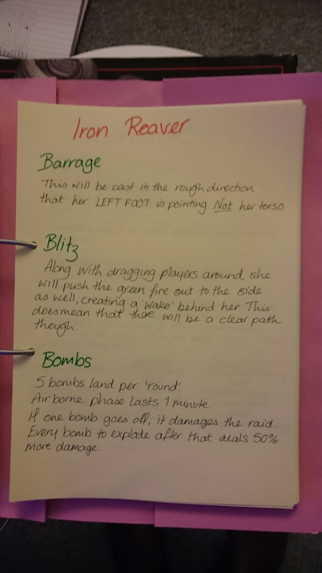 Iron Reaver was next, with the new information about barrage being cast in the general direction of her left foot only three people were caught by it that were not tanks. Also, those three dps and healers were only hit a total of four times. A vast improvement considering our previous performance.