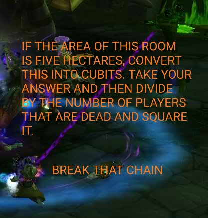 One thing that was a hiccup was the chains and breaking them in order. I use dbm and doing this boss with this group was the first experience I’d had. When we got to the chains part I noticed that amidst the other flurry of text on my screen, it said what chain number I needed to break. ‘Great!’ I though. ‘now I don’t need to be turning my camera all over the place to see who has done what’.